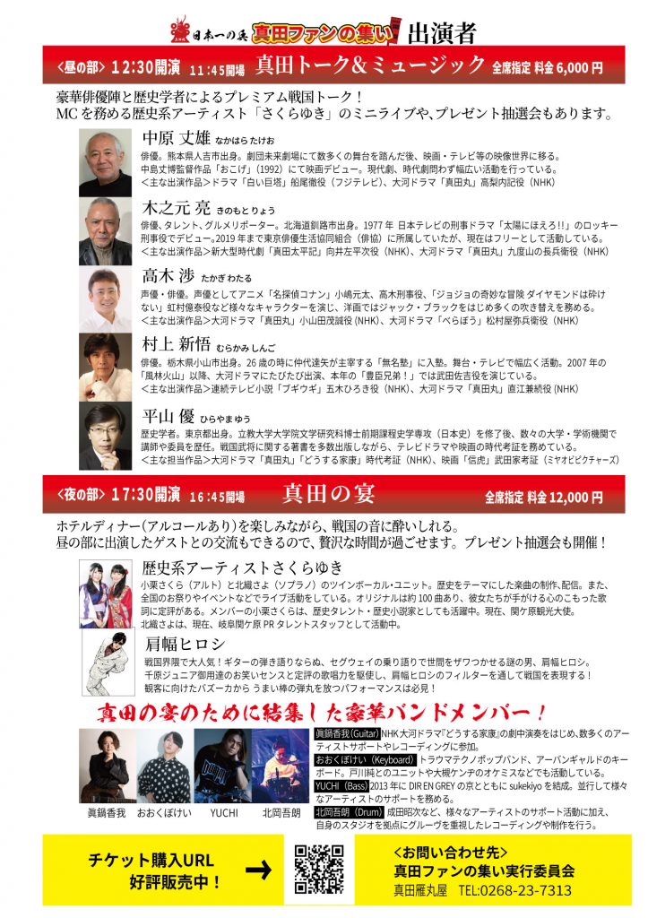 昼の部(12:30開演、6,000円)では、大河ドラマ『真田丸』に出演した豪華俳優陣や平山優先生などの歴史学者による戦国トーク、歴史系アーティスト「さくらゆき」さんのミニライブ、プレゼント抽選会などが行われます。