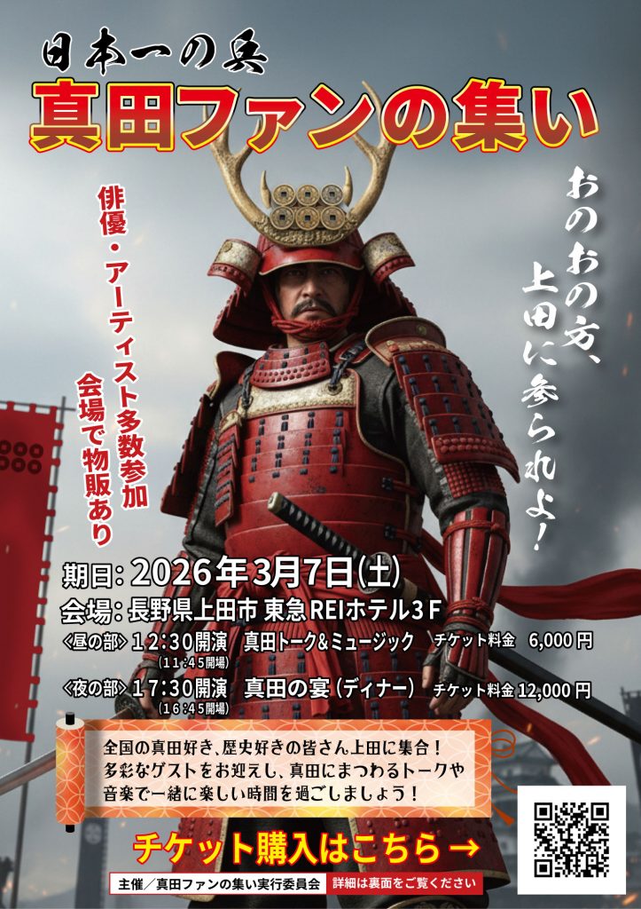 2026年3月7日(土)に長野県上田市の東急REIホテルで「日本一の兵 真田ファンの集い」が開催されます。