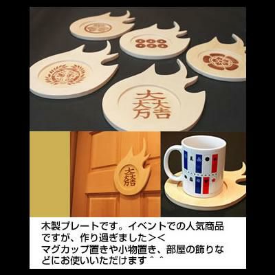 戦国魂の焔(ほむら)マークの中に家紋を焼きプレス。 くっきりと美しく家紋が出ていて、木製ならではの温かみが味わえます。 また戦国CLANデザインコースターを中にセットすることができます!