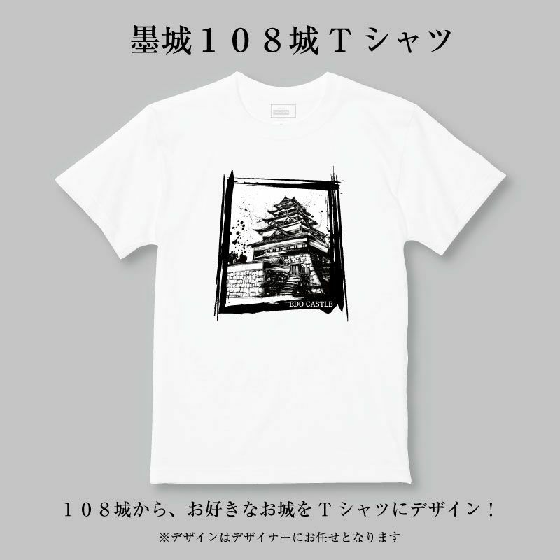 墨絵師御歌頭が描き続けた「墨城」の連作の中から、これはという墨絵108城をTシャツ化!! ※Tシャツ画像はイメージです。 お城によりデザインに若干の違いがございます。