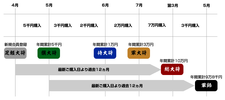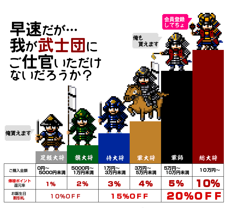 | 軍師 | 過去12ヶ月購入金額5万円以上 | 5% | 20%OFFクーポン | |