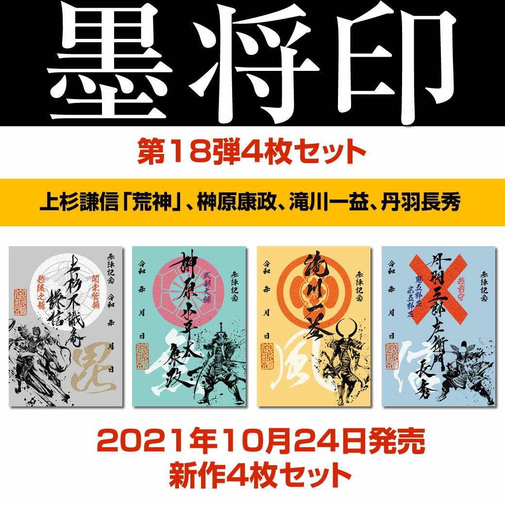 他の画像を見る 墨城印コンプ+墨将印コンプのセットです! 御城印『墨城印』+武将印『墨将印』第18弾パーフェクトセット 価格 ¥ 3,960 税込 ■九戸城,岩出山城,高天神城,一乗谷城,勝竜寺城,岡豊城,唐津城,金田城の8城と上杉謙信「荒神」,榊原康政,滝川一益,丹羽長秀の4武将のセット! ※特典:プレミアム御城印「姫路城 荘厳」+墨戦印「手取川の戦い」の2種類付