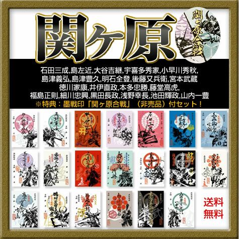 他の画像を見る 初めて墨将印を買う方にもおすすめ! 武将印『墨将印』■関ヶ原合戦 参戦武将セット 価格 ¥ 6,600 税込 会員 ¥ 5,500 税込 ■関ヶ原合戦本戦に参戦した20名の墨将印(武将印)セット! ※特典:墨戦印「関ヶ原合戦」(非売品)付