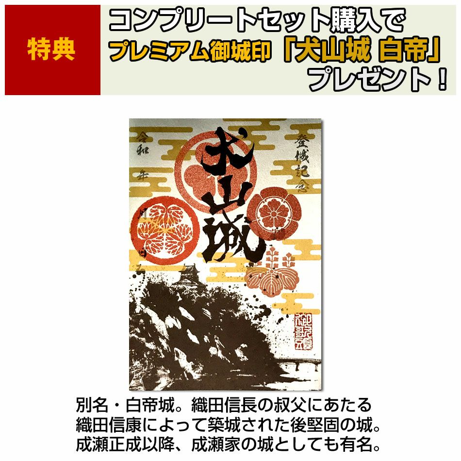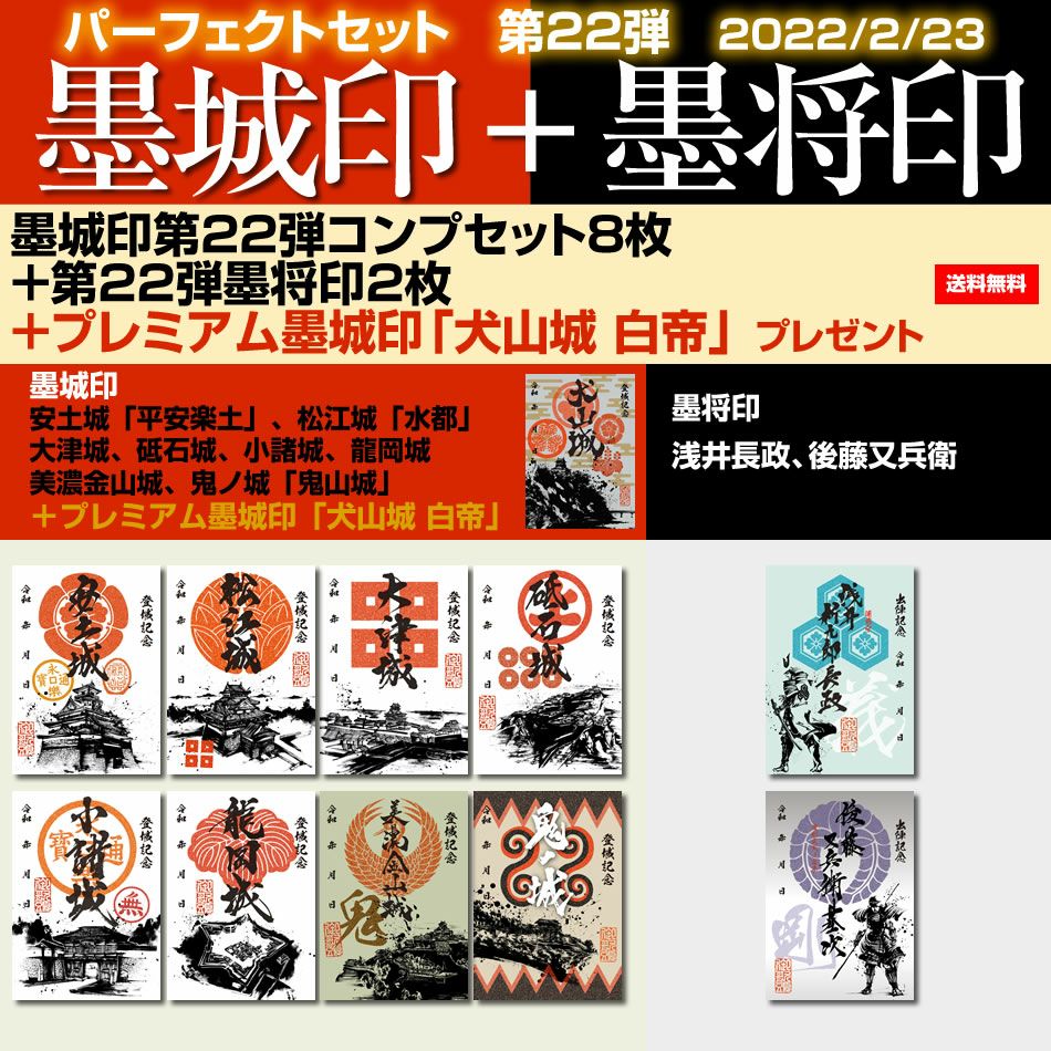他の画像を見る 御城印『墨城印』第22弾コンプリートセット※送料無料 価格 ¥ 2,640 税込 安土城「平安楽土」,松江城「水都」,大津城,砥石城,小諸城,龍岡城と季節之印「鬼ノ城」,「美濃金山城」の8枚セット! ※特典:プレミアム御城印「犬山城 白帝」 ※送料無料となります。