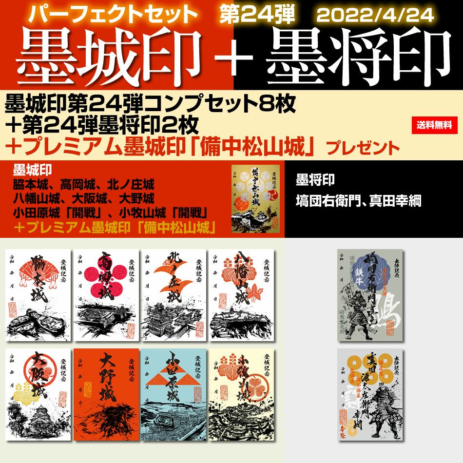 他の画像を見る 御城印『墨城印』第24弾コンプリートセット※送料無料 価格 ¥ 2,640 税込 脇本城、高岡城、北ノ庄城、八幡山城、大阪城、大野城と季節之印「小田原城 開戦」、「小牧山城 開戦」の8枚セット! ※特典:プレミアム御城印「備中松山城」 ※送料無料となります。
